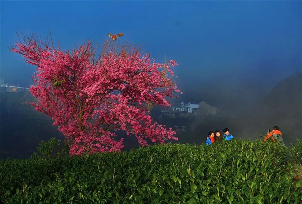 而這山也是極襯這花的。無量山雄奇又不失溫潤秀麗,絲絲縷縷的霧氣不時自山麓間飄來,綿延的茶樹在冬日依舊綠意盎然。千山一碧、云飄霧繞,無量山宛若一塊巨大的臺幕,盡心襯托著冬櫻的光芒四射。