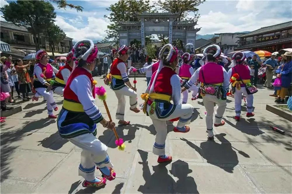 詩歌是有韻律的文字,舞蹈是有節(jié)拍的步調(diào)。而民族舞蹈的形成包含諸多因素,性格開朗且好客的白族先民們崇尚農(nóng)耕,樂習(xí)詩文,正是由于這樣的風(fēng)土人情,白族霸王鞭這種熱情獨特的舞蹈孕育而生,在“繞三靈”“鬧春節(jié)正月”“田家樂”等民俗節(jié)慶活動和建房嫁娶等習(xí)俗中廣泛存在。