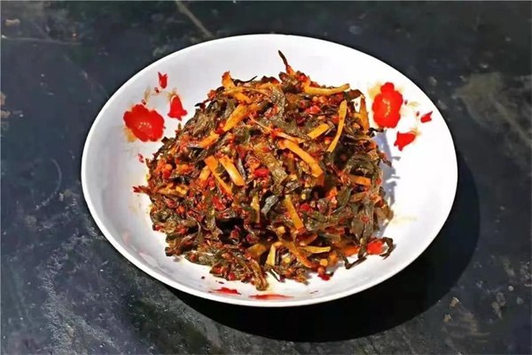 有人概括賓川所謂的“十八怪”,其中有“出外愛帶酸腌菜”這一“怪”。韭菜腌菜是賓川獨有的特產(chǎn),色澤金黃,聞著刺鼻,吃著爽口,可以單獨食用,也可作為炒菜中的輔料,特別適合炒肉和煮魚。