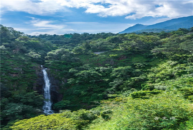這是雞足山的玉龍瀑布,又稱(chēng)大龍湫,其源自天柱峰金頂寺下海拔3100多米的龍王泉,流經(jīng)仰高峽,納滴雪崖、兜率庵石洞和真武洞三泉成三獻(xiàn)水,穿林破霧,奔流而下,到達(dá)落差60米的滴水崖,界破青山,而后形成,是雞足山著名的八景之一即飛瀑穿云。