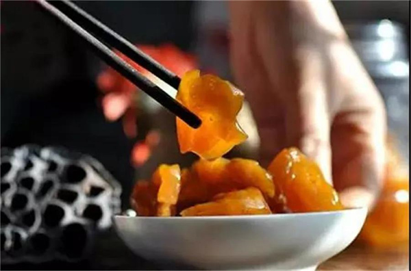 雕梅,顧名思義,一定要“雕”。將成熟的青梅浸鹽腌制后,用刻刀在梅肉上雕刻出花紋,在擠出梅核后將梅子輕壓成餅,便會自然呈現(xiàn)出“菊花”的形狀。腌好的雕梅酸甜可口,嚼起來綿軟而不失嚼勁。