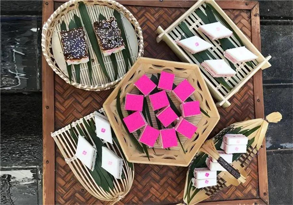 打開鶴慶的米糕蒸籠,在騰騰熱氣中,一塊塊菱形米糕散發(fā)出誘人的米香。鶴慶的米糕分為水糕和干糕,其中干糕中的夾層糕猶具特色,其形狀呈菱形,中間夾有紅糖、薄荷、橙皮、棗泥、龍眼等混合而成的餡層,吃起來細(xì)膩而香甜。