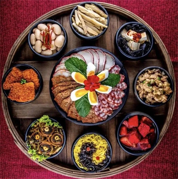 劍川八大碗,上桌講究的就是一個豐富美觀。從食材上來說,有葷有素、有豬有魚、有肥有瘦,口感層次豐富;口味上,有咸有淡、有酸有辣、有干香有鮮美,滿足不同人需求;顏色上,有黃、紅、綠、白、黑等不同色彩,賞心悅目。