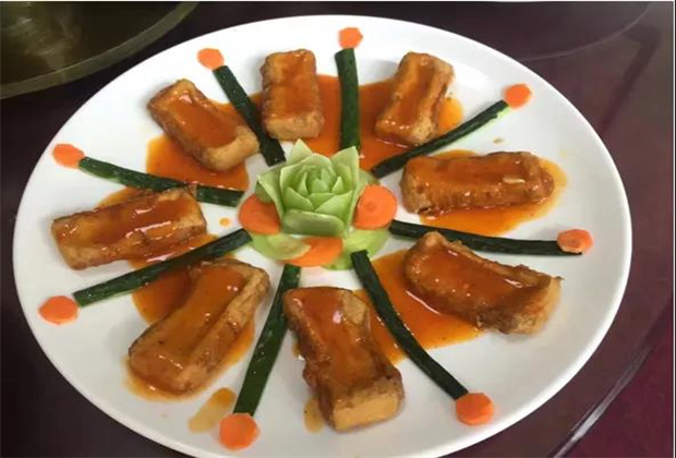 古道飯莊以白豆腐、臭豆腐作為原材料,經(jīng)過不同的烹飪方法及多種多樣的造型設(shè)計(jì),推出了瓦片豆腐、鐵板豆腐、開心豆腐、脆皮豆腐、鍋塌豆腐、果汁豆腐等多種菜品,讓一道道豆腐菜迸發(fā)出全新的味道。