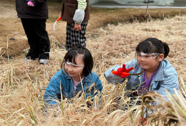 工作人員交代了注意事項,發(fā)放了割麥子的工具。小朋友們戴上小手套和護目鏡,拿起小鐮刀全副武裝,開始了今天的收割體驗。