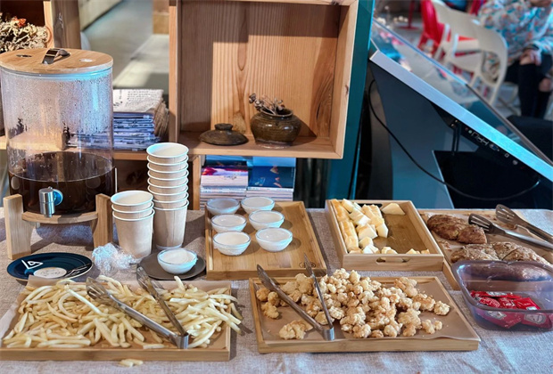 辛苦勞作后的美食,往往更誘人。工作人員準備了紅糖姜茶、薯條、雞米花、水果,還有農(nóng)耕館的特色“喜米布丁”。小朋友們在工作人員的指引下有序的領(lǐng)取餐食。