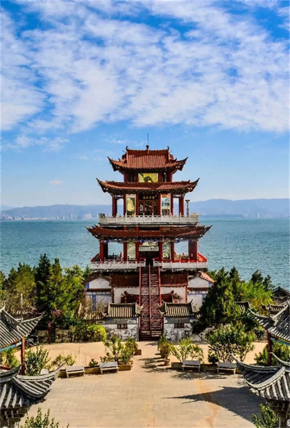 在大理這片東方瑞士的土地上,有一處隱藏在洱海東部的小島,如同一顆明珠鑲嵌在碧波之中,它就是洱海小普陀。這個(gè)小小的石灰?guī)r島,如同一首古老的詩(shī)歌,訴說(shuō)著大理的歷史、信仰和自然之美。當(dāng)船只緩緩駛向小普陀,好像越了時(shí)光的長(zhǎng)河,來(lái)到一個(gè)充滿神秘和傳奇的世界。小島如一顆微小的心臟,跳動(dòng)著洱海的生命之源。碧綠的海水在岸邊輕輕拍打,撫慰著疲憊的心靈。遠(yuǎn)處的蒼山若隱若現(xiàn),如同巨龍騰飛,它是洱海的守護(hù)神,注視著這片湛藍(lán)的水域。小普陀島高出水面十來(lái)米,巖石如雕刻般奇妙,儼然是大自然的杰作。島上的樓閣建于明代,兩層歇山式的建筑在藍(lán)天白云的映襯下顯得格外莊重。第一層塑有如來(lái),莊嚴(yán)肅穆;第二層塑有觀音,慈悲仁愛。這座小巧玲瓏的樓閣,神霧繚繞,如同仙境般令人陶醉。
