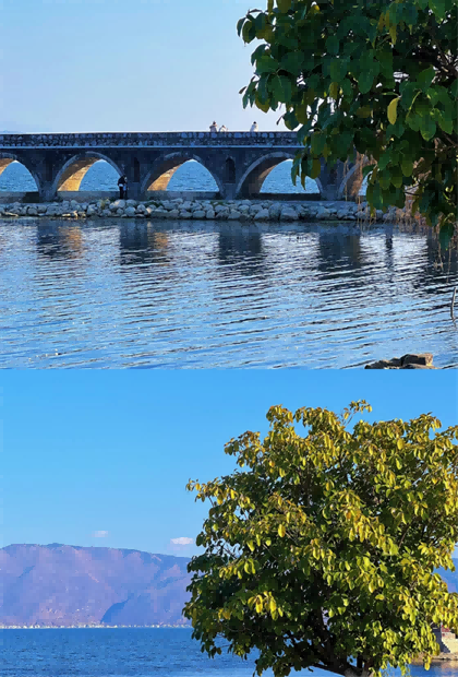 “廊橋”坐落于大理市灣橋鎮(zhèn)向陽溪村的洱海之濱是一座獨(dú)特的水渠其造型如同拱橋一般延伸進(jìn)碧藍(lán)的洱海之中在歷史的歲月里它曾是灣橋鎮(zhèn)重要的灌溉抽水渠為這片土地帶來了勃勃生機(jī)如今它已不再承擔(dān)抽水灌溉的功能成為了一個歷史的見證者“廊橋”最引人注目的是其獨(dú)特的構(gòu)造:十幾個半圓形橋洞如拱橋般連在一起一直延伸至洱海深處無論是站在橋上、橋下還是透過橋洞望去都能看到不一樣的風(fēng)景。