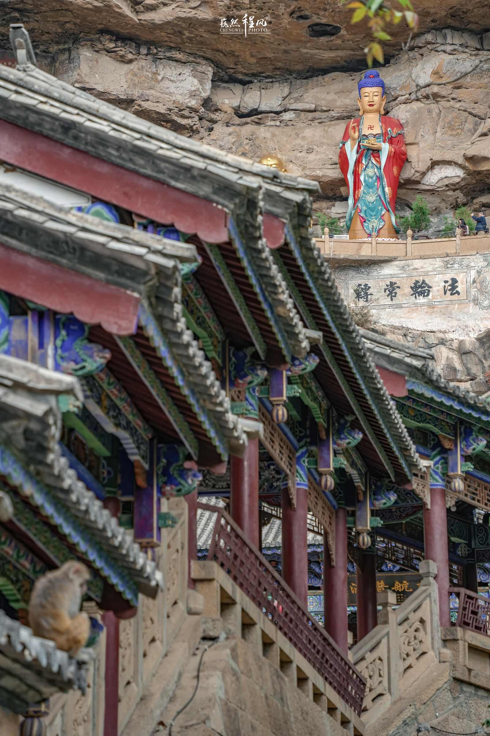 乘坐景區(qū)大巴返程時,會經(jīng)過寶相寺停車點。寶相寺,位于佛頂山上,依山建筑在一堵高聳險峻的大石崖上,下層是大殿,二殿為寺觀,鑿石抬梁,被譽為“云南的懸空寺”始建于元代,最初為道教玉皇閣,后融佛教密宗殿堂,形成"崖窟藏佛閣,云霧繞道觀"的奇觀。從下車點到寶相寺山門,需徒步約15分鐘的臺階,路上能遇見許多野生靈猴守護山門,活脫脫武俠片中的隱世門派。