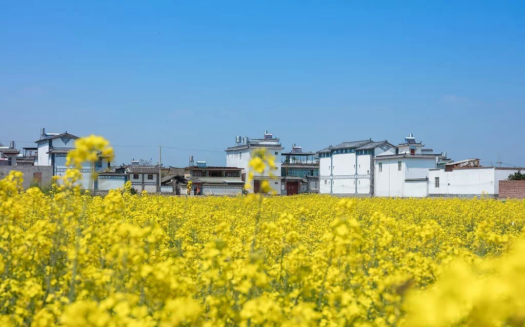 陽光正好,春風(fēng)拂過,大片的油菜花在藍(lán)天白云之下掀出一陣陣金色的波浪,與周圍錯(cuò)落的白族古建筑群相得益彰,將春天的深情在這里灌溉。給這個(gè)隱秘的古鎮(zhèn)增添了一份恬靜、一份安寧、一份祥和。