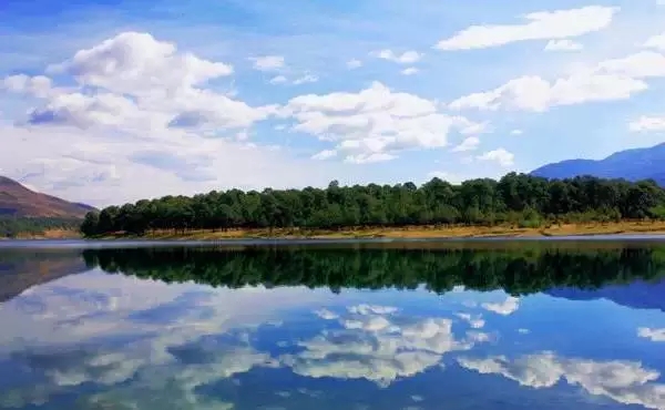 黃龍?zhí)短烊毁|(zhì)樸,潭邊多柳樹,它們生長在湖底的高地上,豐水季節(jié),只冒出一半枝干,遒勁的身軀浸泡在水中。