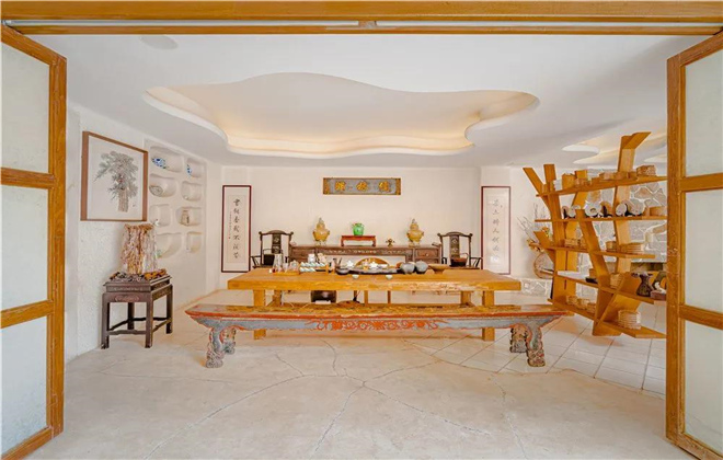 茶室內(nèi),只見左邊墻壁的鏤空洞穴里擺放著許多古玩茶具;靠窗的茶桌旁,布置一個大大的壁爐,風雪交加之際,當壁爐內(nèi)燃起炭火,溫暖從腳邊升騰,直抵心尖。