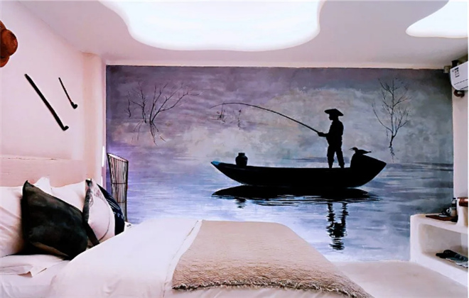 名為“漁歌唱晚”的房間內(nèi),一幅大大的洱海打漁壁畫上,漁夫正在垂釣。草帽、漁網(wǎng)、魚簍隨處可見,行走其間,洱海邊世世代代打漁人的打漁時光漸漸浮現(xiàn)。