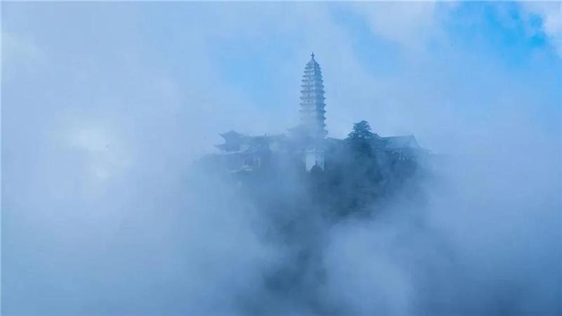 雞足山群峰莽莽蒼蒼,名木古樹連綿成綠海森林,絕頂四觀乃古今之勝。尤當(dāng)云雨天氣,常可見“霧鎖金頂”,置身其間,恍入仙境。