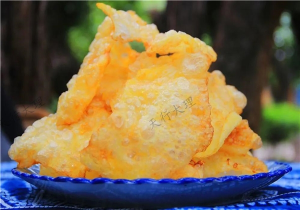 很多大理人,尤其是許多沿洱海而居的大理人,一定吃過炸魚鱗這道菜。利用魚鱗與鹽、花椒面等均勻攪拌后煎炸出來的魚鱗,金黃酥脆,而且還可以補鈣,營養(yǎng)價值頗高。