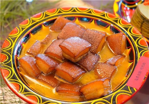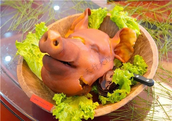 豬和雞為彝族必須的祭祀用品,是彝族最早馴化的動(dòng)物之一。豬頭肉皮厚而富膠質(zhì),肉少而嫩,耳骨脆而可食?!鞍窍阖i頭”彝語“嗬蜜哈”,系南詔宮廷美食,成菜色澤紅潤,香糯濃醇,咸甜適度。