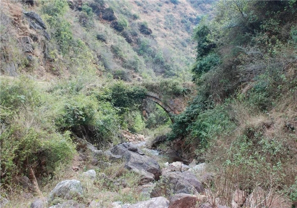 白崖古道自東而西,從今祥云云南驛經(jīng)彌渡新發(fā)村金殿窩(又名鋪山),雞鳴村達(dá)白崖古城,往西經(jīng)化城,橋頭哨,一條古老的驛道便呈現(xiàn)眼前。古道寬三、五米,皆由大小青石相砌,千百年來(lái),風(fēng)吹雨淋,人踏馬踐,留下了無(wú)數(shù)深深淺淺的履痕蹄跡。路旁雜木叢生,百草豐茂,一澗山水淙淙南流,唱著千年古道挽歌??芍^“人稀地僻境幽幽,鴻澤無(wú)聲一水流”。沿著曲曲折折的驛道由南而北,幾經(jīng)峰回路轉(zhuǎn),一橋長(zhǎng)虹臥波,橫跨南北,這便是著名的天馬關(guān)橋。