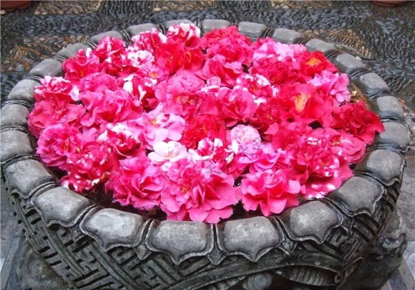 還有飄在水中的茶花,仿佛水也是紅的,一盆盆一缸缸艷美,不像在腳下,倒像在心底,看久了心事都會看化。按張家花園的傳統(tǒng),飄過三天,那些茶花就會變成花肥,綻放在次年春天枝頭,而這一季的盛放中,仍有上一年的落紅藏底,如此落落開開,年復(fù)一年。