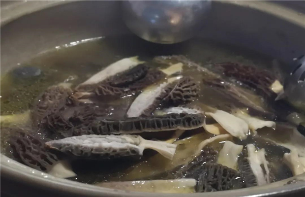 第二重奏,菌香層層疊疊的山珍湯。喝罷雞湯,再舀一輪雞肉,之后,加湯,下鍋各色野生菌,像冷菌、香菌、牛肝菌、羊肚菌、松茸、松露、虎掌菌之類的。此時需要加完所有的菌子入鍋煮,繼續(xù)吃碗里的雞肉,吃草帽餅,吃雞豌豆涼粉,慢慢閑聊,直到20分鐘以后,鍋里的菌子煮熟且出味,才能進行新一輪的海吃。