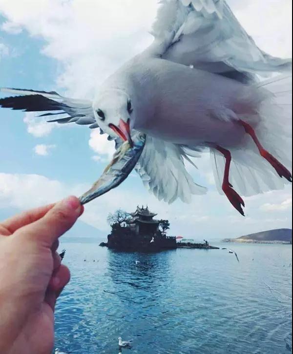 如果你在環(huán)洱海時(shí)到了小普陀,或者恰巧路過,那么你總能見到一群活潑的”小精靈”,它們或停歇,或盤旋,或飛到你的身邊嘗一嘗食物的味道。