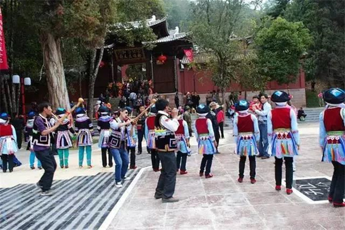 除了濃郁的宗教風(fēng)格造就了“巍寶仙蹤”之外,山中的奇景還形成了有名的巍山八大勝景:拱城遠(yuǎn)眺、天門鎖勝、美女瞻云、龍池秋月、山茶流紅、鶴樓古梅、朝陽育鶴、古洞長春。有關(guān)勝景,這里還有一個神話故事,相傳,八仙之一的何仙姑路過此地時,恰逢彩云顯現(xiàn),美麗的云景使她芳心大動,便不禁臥下仰望云景。后來,在何仙姑躺過的地方長出了三座呈“美女仰臥”形狀的山峰,仙姑不慎失落的珍珠則化作了中央的水池,形成了“美女瞻云”的絕景。巍寶山還是彝族民俗活動的重要場所,每年農(nóng)歷二月十三日至十五日的巍寶山歌會便聚集于此,成為附近彝族青年男女的狂歡節(jié)。