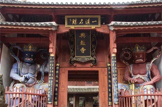 古寺叫興教寺,建于明永樂十三年(1415年),是國內(nèi)僅存的白族阿吒力教(佛教直接從印度傳入大理后形成的流派,區(qū)別于漢傳佛教和藏傳佛教)寺院。阿吒力教崇拜阿嵯耶觀音和大黑天神,僧人可以娶妻,亦可參政議政。氣勢軒昂的殿宇內(nèi)外,明代佛教壁畫雖然蒙塵,但是綺麗依舊。