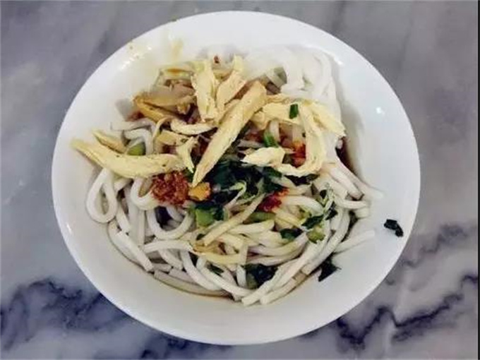 它的基礎(chǔ)配料之中,最具統(tǒng)帥性質(zhì)的是鹵汁,幾味秘制調(diào)料配以雞湯,鮮香之味盡在其中;涼雞,這可是為米線冠名的核心,精制的涼雞肉絲靜臥于綿軟潤白的米線之上,再加上燙熟的豆芽、鮮嫩翠綠的韭菜或芥藍,鹽、醬油、味精、蒜汁、花辣椒椒油、油調(diào)入其間,最后,記住一定還要有煎過舂碎的核桃仁或花生仁作點睛之物;其特點是色澤清白相間,外形美觀,香鮮清涼。